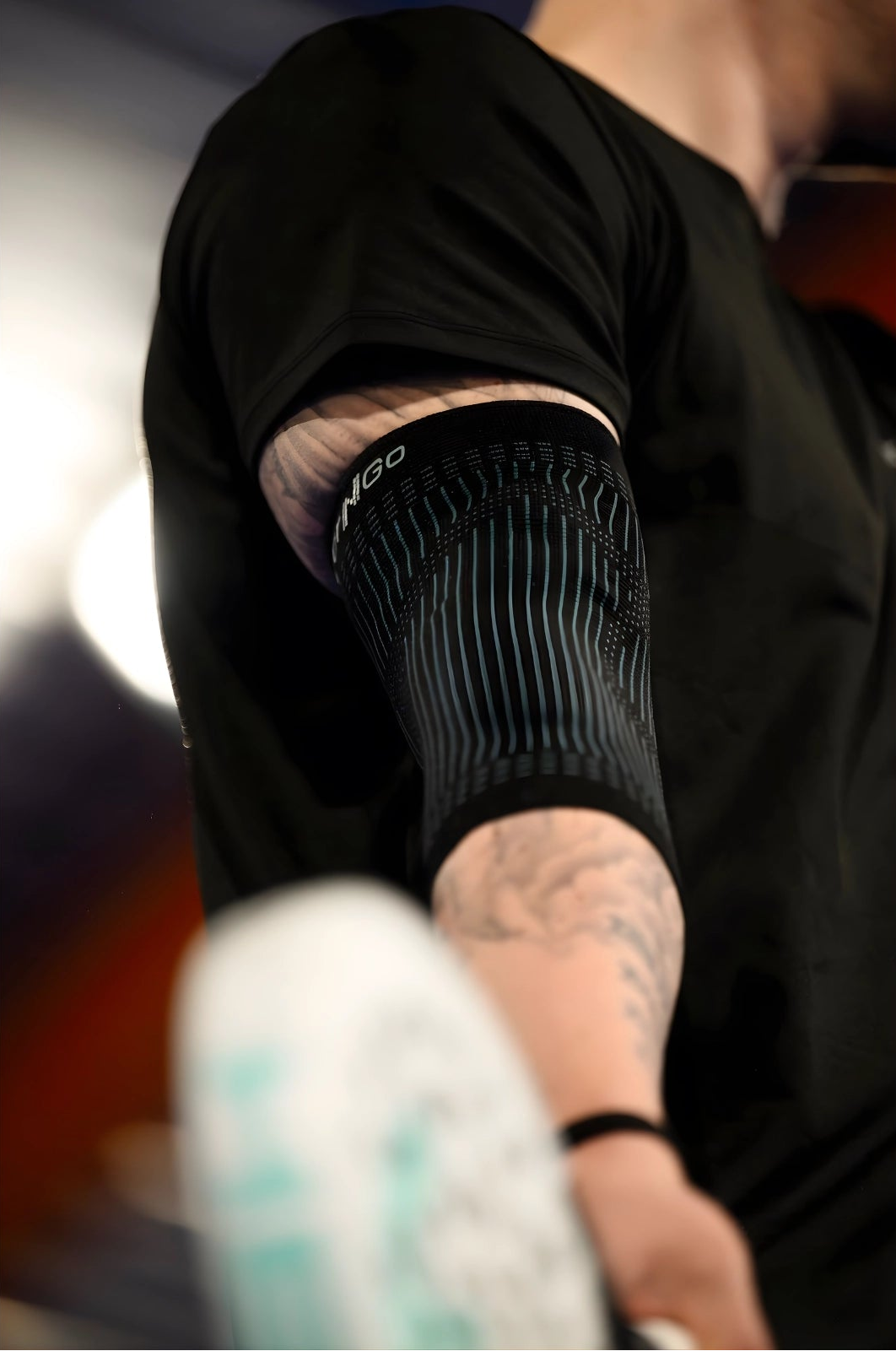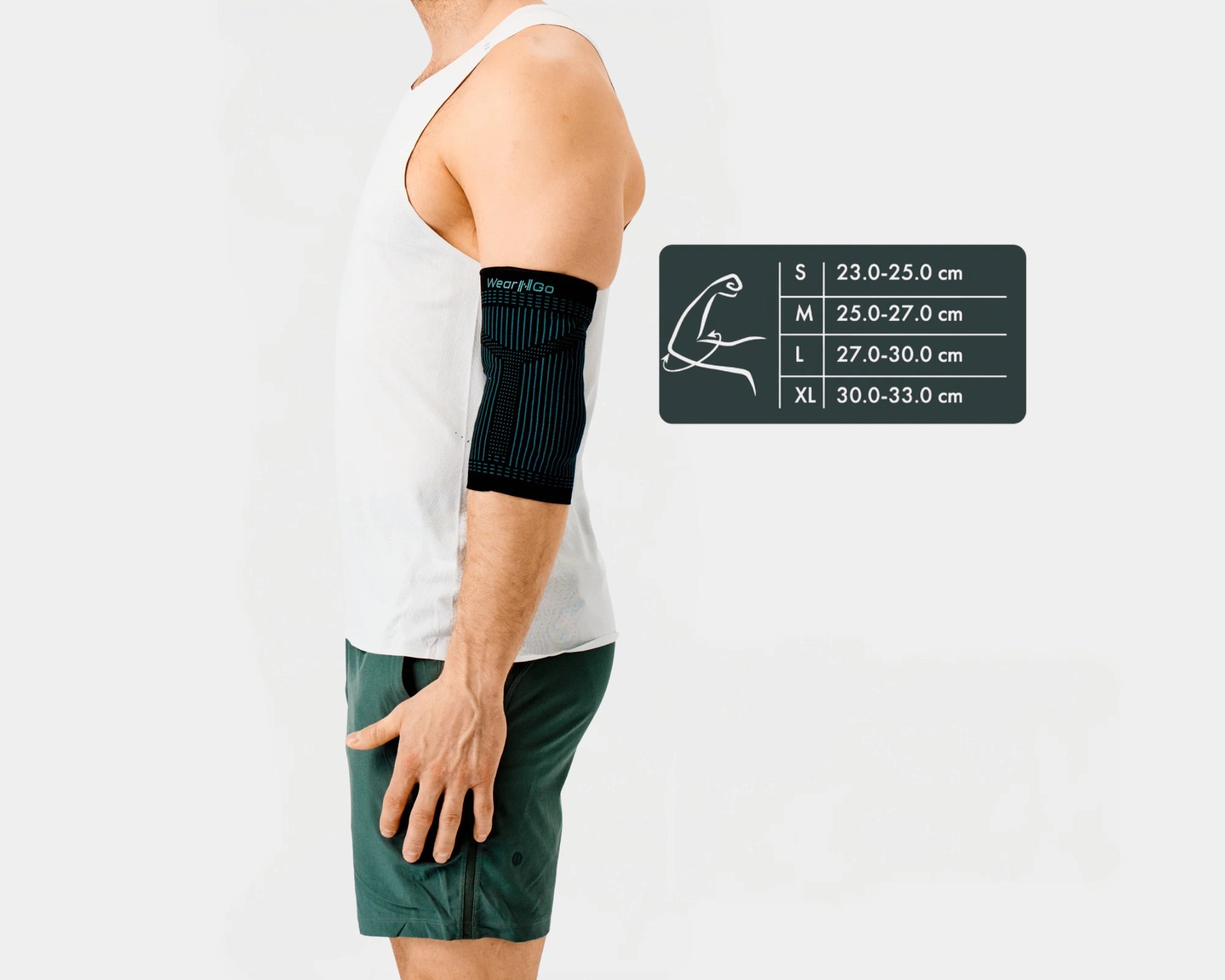 Albuestøtten skal sitte støttende og komfortabelt rundt albuen, og silikonputene skal plasseres over og under albuen – ikke over albuespissen. Den kan brukes på både høyre og venstre arm.